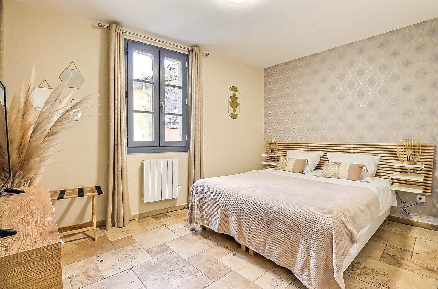 → d’une chambre avec lit double 160 x 200 cm, placard et TV